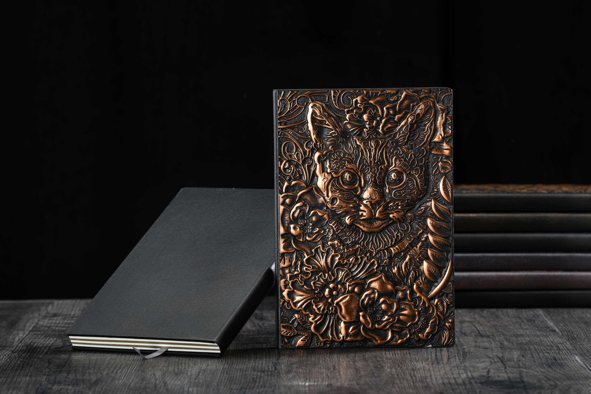 3D EMBOSSED LEATHER COVERED TRAVELLERS JOURNAL - CAT RED - A5 SIZE